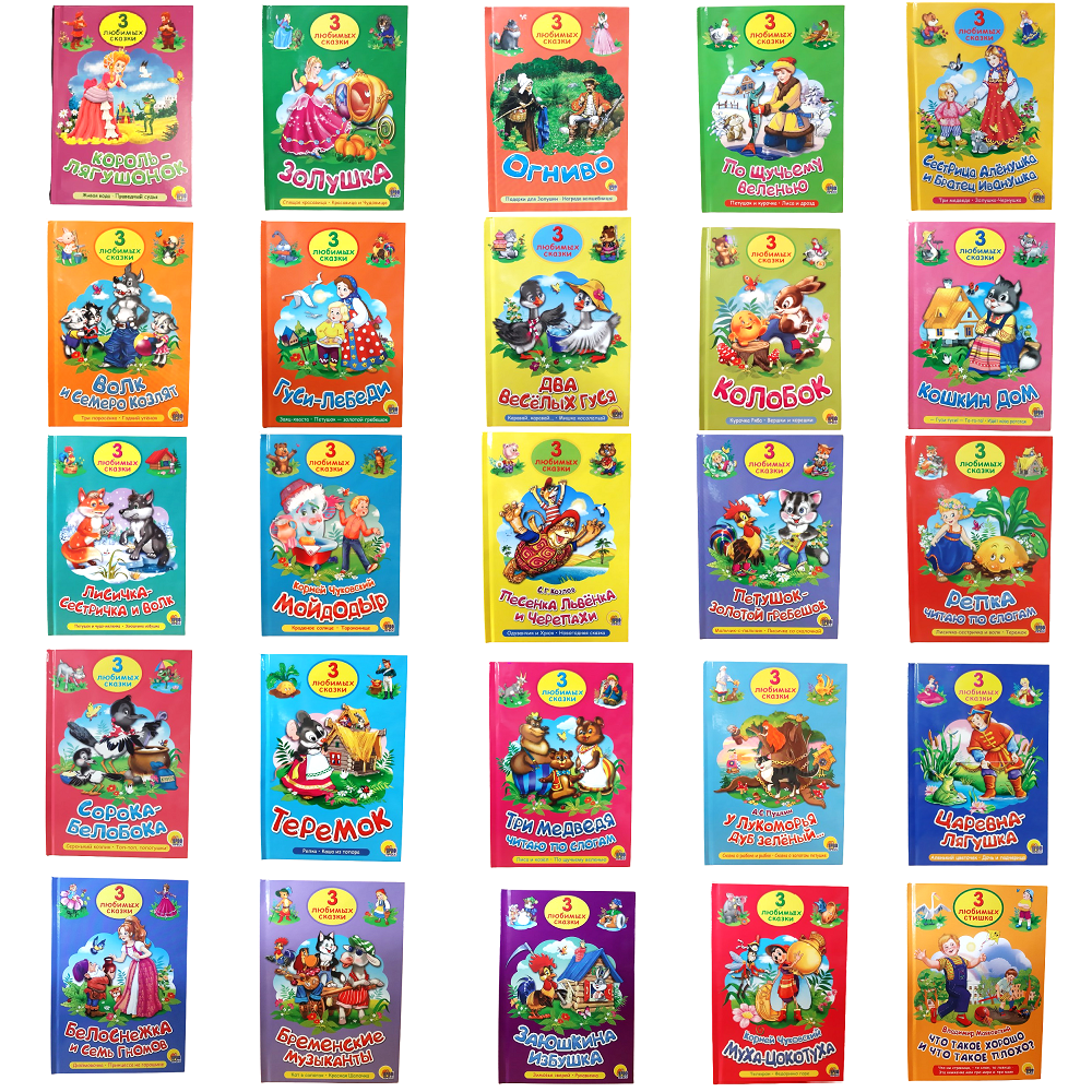Огниво, Король лягушонок, По щучьему велению, Золушка, Царевна – лягушка, Волк и семеро козлят, Колобок, Сестрица Алёнушка и братец Иванушка, Муха – Цокотуха, Мойдодыр, Теремок, Песенка Львенка и Черепахи, Кошкин дом, Сорока – белобока, Гуси – лебеди, Петушок-золотой гребешок, Лисичка – сестричка и волк, Репка, ТРИ МЕДВЕДЯ. ЧИТАЮ ПО СЛОГАМ, У Лукоморья дуб зеленый, Два весёлых гуся, МАШЕНЬКА И МЕДВЕДЬ, ЧТО ТАКОЕ ХОРОШО И ЧТО ТАКОЕ ПЛОХО, Бременские музыканты, Белоснежка и семь гномов, Заюшкина избушка