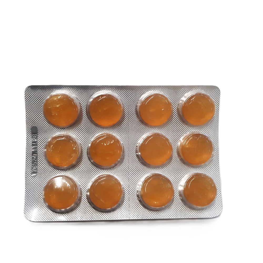 Nahrungsergänzungsmittel; Zutaten: Sacharose, Glycose, Propolisextrakt, L-Askorbinsäure (Vitamin C), Säureregulator Zitronensäure, Honig, Aroma, ätherisches Zitronengrasöl, Menthol, Ingwerextrakt. Verzehrsempfehlung: Erwachsene nehmen 1 Tablette bis 6mal am Tag. Kinder ab 6 bis 12 Jahren nehmen 1 Tabletten bis 4mal am Tag. Nährwertangaben für 1 Tablette: Propolisextrakt 35 mg, Ingwerextrakt 1 mg, Zitronengrasöl 1,5 mg, Vitamin C 20 mg; (25%*); f.4 Tabletten: Propolisextrakt 140 mg, Ingwerextrakt 4 mg, Zitronengrasöl 6 mg, Vitamin C 80 mg; (100%*); f. 6 Tabletten: Propolisextrakt 210 mg, Ingwerextrakt 6 mg, Zitronengrasöl 9 mg, Vitamin C 120 mg; (150%*); *NRV=Referenzwert nach EU-LMIV.